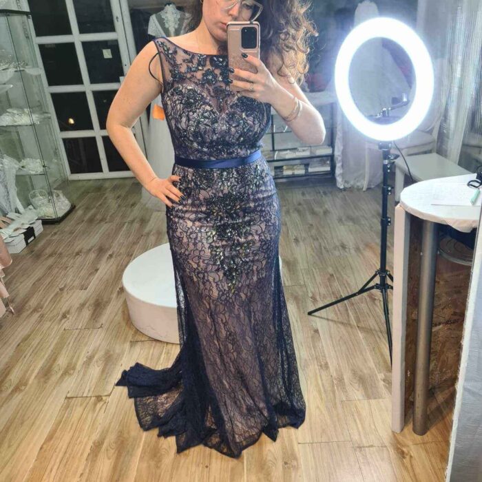 שמלת ערב צמודה , בצבע כחולה מהממת מבד מחורז ותחרה .